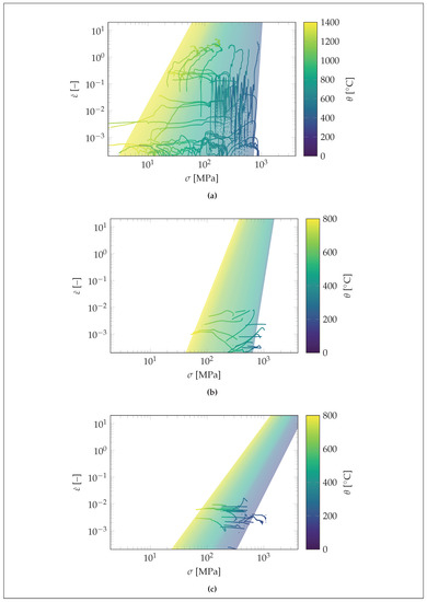 Concerning Equation (3), the characteristic intersection point has to be re-evaluated, too, to satisfy (4) for . To maintain the same high strain rate senstivity at high temperatures around the melting point and assuming that the low sensitivity for low temperatures will not change, point is identified using