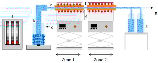 Experimental set-up used for ultrasonic spray syntheses (a) gas flow regulation of N2 and H2, (b) ultrasonic generator with precursor solution (c) gas inlet 1, N2 (d) gas inlet 2, H2, (e) furnace 1, (f) furnace 2, (g) gas outlet and (h) collection bottles