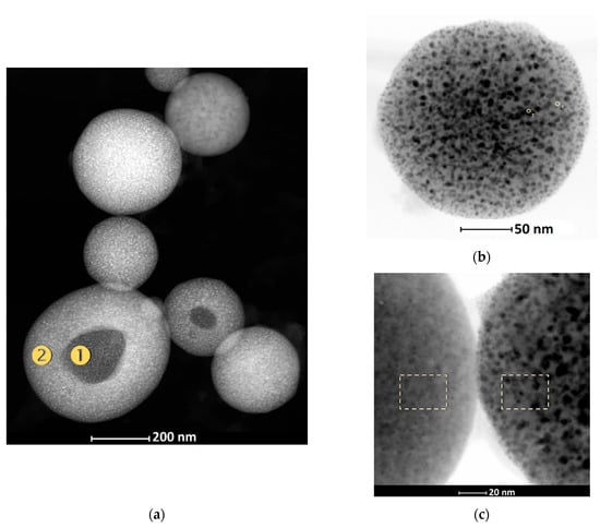 The second-generation hollow spheres with holes of smaller diameter will then be formed, as seen in Figure 2a right beside the largest hollow sphere (first generation). The gelled sphere, being small enough, will turn solid throughout the volume without a breaking of the shell, which produces the solid spheres. These spheres are seen in Figure 2a with no holes on their surfaces, and they have sizes below the average (131 ± 42 nm). This mechanism can be visualized as the “opening of the Russian nesting doll”, which produces the particulate composition of the novel USP-synthesized Pt/TiO2 composite, colloquially defined as “Russian nesting doll”-like Pt/TiO2 spherical particles.