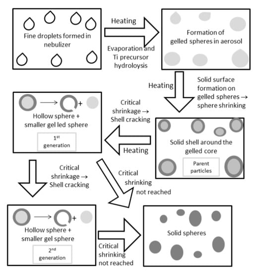 These findings allow us to propose the following mechanism for the USP generation of a Pt/TiO2 composite, as schematically presented in Figure 3. Fine droplets of aerosol are initially formed from the precursor solution in the nebulizer, which are subsequently transferred to the high-temperature zones of the USP furnace. If the droplets pass through a gel phase upon sudden heating, the solid shell around the gelled sphere could be formed during continued heating. It should be noted that it was observed that the precursor solution turns into sol after several weeks, which indicates the possibility of a sol-gel transition. Owing to thermal tensions during the solidification of a gel, it appears that the shell shrinks more rapidly than the gel is being solidified, which causes the shell to crack. The remaining highly tense gel phase flings off the shell, leaving a circular hole in the spherical wall, i.e., a new gelled sphere is delivered by its parent, which turned into a solid hollow sphere. If the shrinkage in a newly-born gelled sphere would prevail in the solidification of the interior, the delivering mechanism could be repeated.
