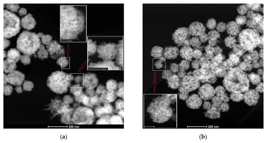 STEM images of spherical Pt/TiO2 particles of near-average diameters are shown in Figure 2b,c. Figure 2b illustrates the granular appearance of the Pt (20 mass %)/TiO2 sphere, with the surface populated by particles within the 3.4–7.8 nm size range, of an average diameter (±SD) of 5.2 ± 0.9 nm. However, the structure of the surface of the sphere walls depends on Pt content. The STEM appearances of an area of the two spheres of similar size, synthesized with nominal Pt loadings of 5 and 20 mass %, are compared in Figure 2c. The surface of the sphere with lower Pt loading (on the left in Figure 2c) appears smoother and more compact than the sphere with the higher Pt loading (on the right in Figure 2c). Higher Pt loading causes the sphere surface to show black spots-like particles that are 5.2 ± 0.9 nm in size. In order to identify the composition of the morphological elements at the sphere surface, EDX analysis has been performed, and the data related to area and point markers in Figure 2 are given in Table 2 and Table 3.