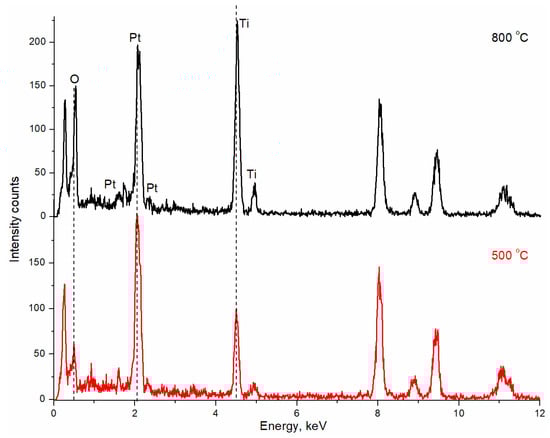 EDX Spectra of USP ex-situ prepared Pt/TiO2 at 800 °C and 500 °C.
