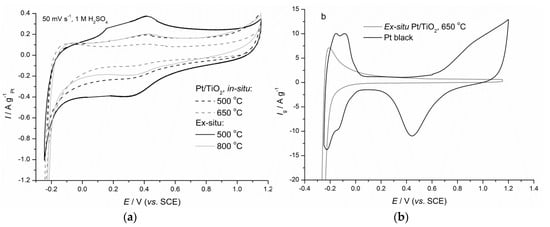 Comparison of cyclic voltammograms of Pt/TiO2 composites and Pt black (a) and ex-situ at 650 °C (b) in de-aerated 1.0 M H2SO4, sweep rate 50 mV·s−1.