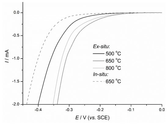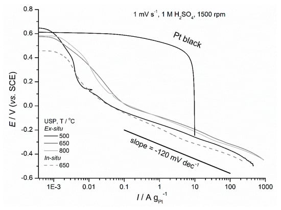 As already observed in CV responses (Figure 6), where the highest currents in HE region were registered for the 650 °C sample, this sample shows best polarization characteristics, as seen in Figure 7. In general, the ex-situ synthesized samples have considerably higher OR/HE activity compared to the activity of samples synthesized in-situ. The differences in activity are to be assigned to different component distributions and surface compositions of the spheres as constituents of in-situ and ex-situ synthesized Pt/TiO2. Pt loading at the surface of ex-situ synthesized spheres is higher and exceeds nominal loading, since small Pt particles decorate uniformly and cover regularly the surface of TiO2 spherical core. Pt particles are smaller than those prepared in-situ. This hierarchy is beneficial for full availability of high-surface-area Pt for the OR/HE process. The in-situ prepared Pt/TiO2 has lower surface Pt loading, with most of the active components constituting the walls of huge hollow spheres or the inactive cores of smaller spheres. These morphological elements have randomly mixed components and larger Pt particles which are hardly accessible as reaction sites (those facing the interior of the hollow spheres or being buried inside the solid spheres). Hence, the differences seen in Figure 6a,b are due to larger number of active sites readily accessible for the reaction in the case of the ex-situ synthesized Pt/TiO2 composite.