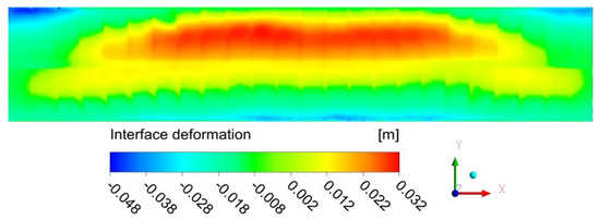 The interface deformation range generally agrees well with the normal distribution. From the simulation results shown in Figure 3, the interface deformation height in most of the area (97.9%) is within the range of ±0.03 m, only 2.3% of the area shows the interface height of below −0.030 m, which occurred at the corner of the DE and side B. The area with an interface height of above 0.030 m is less than 0.1%.