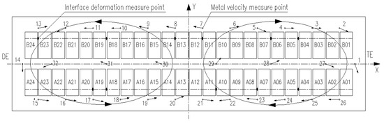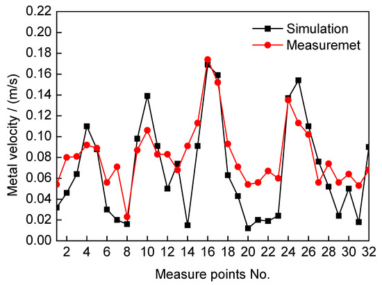 The simulation results, as introduced in the reference state, were then validated with measurement results in a 500 kA industrial cell. The metal flow field and interface deformation were measured with iron rod dissolution method [26] and multi-points upper height measurement, respectively. The measurement positions and the metal flow velocity vectors are drawn in Figure 5. The comparison of metal flow velocity and interface deformation between the simulation results and measurement results are shown in Figure 6 and Figure 7, respectively.