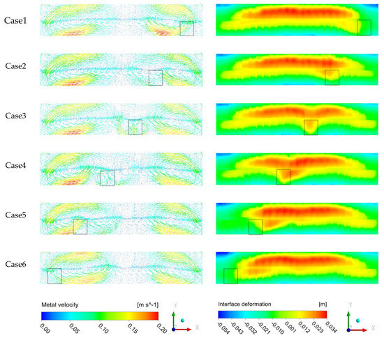 In this study, it was assumed that the cathode flexes at positions A2A3, A6A7, A10A11, A14A15, A18A19, and A22A23 at side A were cut off, respectively, to investigate the impact of LCEC on the melt flow field. The simulation results of the metal flow field and interface deformation are shown in Table 2 and Figure 8.