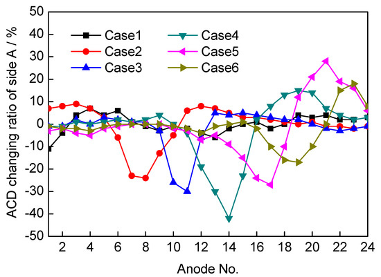 Based on the simulated ACD value under each anode in the reference state, the ACD changing ratios for each anode under six abnormal states were calculated with Equation (10). The ACD changing ratios at side A and side B are shown in Figure 9 and Figure 10, respectively.