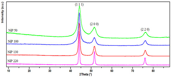 The XRD patterns of as-prepared powders presented the symmetry of the pure nickel (Figure 1). The best refinements of these diffractograms were obtained using a cubic face-centered crystal symmetry with almost similar lattice parameter (a = 3.523 Å) to that of pure Ni (PDF card No. 04-0850, a = 3.524 Å), despite the presence of a significant amount of P (2%–4% by weight) [7,8]. This P composition is significantly higher than that reported in the stable equilibrium diagram of the Ni–P system wherein the solid solution Ni–P is very limited in phosphorus content, not exceeding 0.17% by weight [12]. Thus, the as-obtained alloys can be considered as metastable phases. TEM studies have shown that the particles obtained are equiaxed, with size varying in the range of 50–220 nm (Table 1) (see Supplementary Material S1).