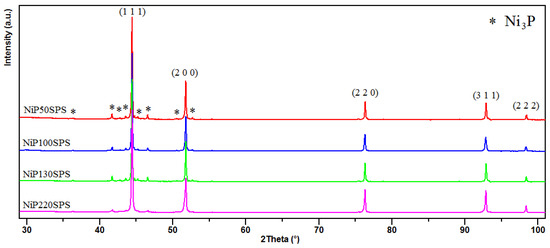 The XRD patterns of densified samples obtained by the R-SPS process showed, besides intense peaks of Ni, the presence of low-intensity peaks (Figure 2). According to the X-ray diffraction database, these peaks can be attributed to Ni3P phase (PDF Card No. 34-0501). This phase was formed during the SPS process and derived from the use of sodium hypophosphite in the synthesis process [6]. Actually, SPS acted as a reactive process and transformed the metastable alloys into bulk submicrometer grain-sized MMCs, where the matrix was composed of nickel and Ni3P was the reinforcement phase formed during sintering. The mechanism of this phase apparition assumed the diffusion of phosphorus from the inside of the initial nanoparticles to the grain boundaries, where nucleation and growth of Ni3P nanoparticles occurred. Grain growth during heat treatment by SPS was accompanied by narrowing peaks observed on XRD patterns.