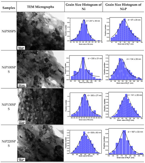 TEM investigations of the microstructure of the bulk samples and the grain size distributions determined by TEM are presented in Figure 3. It was found that the mean grain size values for nickel depended on the size of the starting Ni–P alloy nanoparticles. The larger the size of the initial particles of Ni–P alloys, the larger the grain size of Ni present in the MMC materials—about 3–5 times larger than the mean particle sizes in the initial powders (see Table 1). However, the grain growth was more important when the starting nanoparticle size was lower, indicating that the high-temperature consolidation (600 °C) resulted in grain coarsening, in agreement with previous reports [13,14]. It should be noted that the grain size of Ni3P nanoparticles increased concomitantly with that of Ni, which was the matrix phase.
