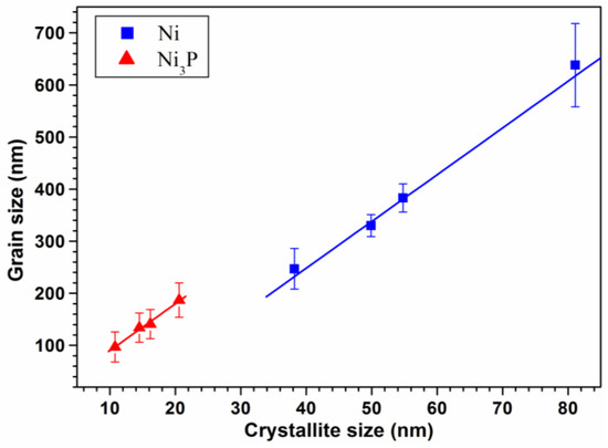 The crystallite size of both phases is given in Table 1. The variation of the grain size of nickel and Ni3P as a function of crystallite size is illustrated in Figure 4. Regardless of the particle size of the starting powders, an almost linear correlation was observed between the crystallite size and the grain size for both phases. Indeed, the grain size increased as the crystallite size increased.