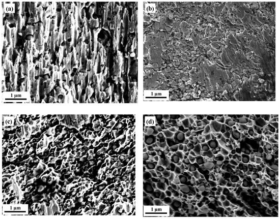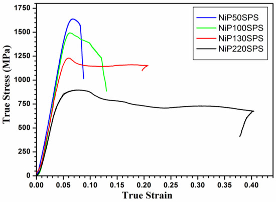 The fracture surfaces of the submicrometer grain-sized samples after compression tests at room temperature (RT) were observed by FEG-SEM (Figure 6). The fracture surfaces showed that the behavior of these materials varied between that of a hard and brittle material (NiP50SPS) and that of a ductile and low-strength material (NiP220SPS). Indeed, for the NiP50SPS sample, the rupture was fragile, characterized by a shiny surface with rivers and ridges, on which one can notice the presence of grains (Figure 6a). On the contrary, the fracture was essentially ductile in the case of the NiP220SPS sample, characterized by the presence of cupules and cones (Figure 6d). The transition between brittle and ductile failure was not sudden; in fact, the intermediate samples NiP100SPS and NiP130SPS (Figure 6b,c) present both fragments with ductile fracture along with fragments with a brittle one.