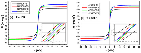 The magnetic behavior of MMC samples was studied by measuring the static magnetization as a function of the magnetic field at two different temperatures: 10 and 300 K. Figure 7a,b show the hysteresis loops of all the samples at 10 and 300 K, respectively. Table 4 reports the average grain and crystallite size together with the magnetic characteristics of these materials (coercive field, magnetization at remanence, and saturation). It should be noted that the magnetic characteristics of NiP100SPS obtained in the present work are, within the experimental error, in good agreement with our previous results [8].
