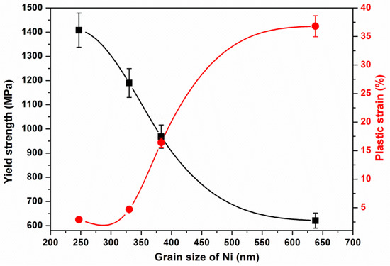 Yield strength, maximum stress, and plastic strain are mainly driven by the grain size of Ni, which constitutes the matrix. Figure 8 reports the yield strength (maximum stress is not reported, as it behaves similarly) and the plastic strain as a function of grain size. Similar behaviors were observed for MMCs published in the work of [8]. As shown in Figure 8, yield stress increased when the grain size decreased. Conversely, the plastic strain increased when the grain size increased. An important crossover of the mechanical response of the MMCs appeared around 350 nm of Ni grain, which corresponded to a crystallite size of around 50 nm. It is interesting to note that this threshold value was also observed for MMC samples studied in the work of [8] (Figure S2).