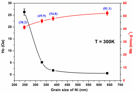 The magnetic properties were also found to be closely related to the Ni grain size (Figure 9). The coercive field (Hc) increased when the grain size decreased, similar to yield strength, while saturation magnetization values (Ms) increased with the grain size in a manner similar to the plastic strain (curves corresponding to previous work [8] are shown in Figure S3). Like the mechanical behavior, a crossover behavior was observed around 350 nm of Ni grain size for the magnetic behavior of both sample series elaborated in the work of [8] and the present work. It is interesting to notice that this grain size corresponds to a crystallite size of around 50 nm, which is the critical crystallite size of the Ni magnetic mono-domain (Table 4) [31].
