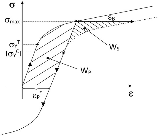 where σmax is the stress at maximum loading or pre-stress, σYC is the yield strength at the compression stage (σYC < 0), εB is the Bauschinger strain, εP* is the plastic pre-strain, WS is the Bauschinger energy factor and WP the plastic pre-strain energy density. Involved parameters are defined as shown by the scheme in Figure 1 displaying the hysteresis loop obtained from a Bauschinger test, where the compression curve is mirrored in the tensile domain (dashed line in Figure 1) to simplify the parameter definition. In this plot, the tensile yield strength is denoted as σYT. Accordingly, a material does not exhibit BE when the aforesaid parameters βσ, βε, and βW are null. The values of these parameters establish the degree of BE quantitatively.