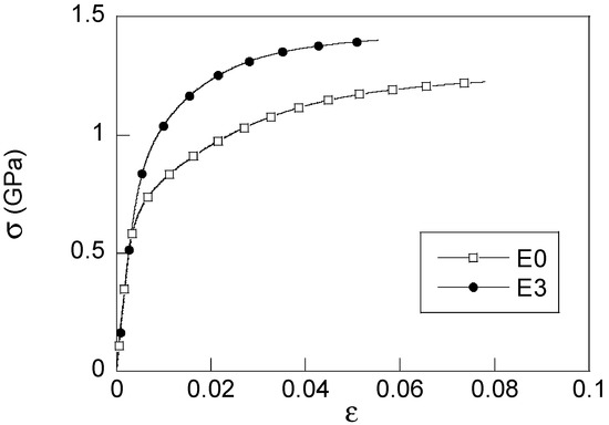 Stress-strain curves of the steels E0 (open symbols) and E3 (full symbols).