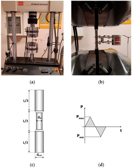 The tests were carried out under displacement control imposing limits on maximum load. Cyclic loading between the extremes of the same absolute value in tension and compression was applied at constant displacement rate of 2 mm/min (Figure 5d). The upper and lower load limits in each test were determined from the steel flow curves obtained from tensile tests (Figure 4) in correspondence with plastic strain levels applied during cyclic loading of the hot rolled steel and of the cold drawn one as indicated in Table 2.