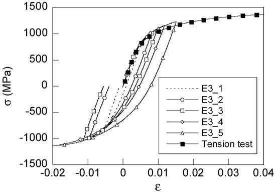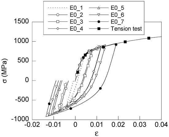Figure 6 shows the hysteresis loops for the steel E0 that were obtained in the Bauschinger tests performed at seven pre-strain levels specified in Table 2. For comparison, the flow curve obtained from the tension test of the same steel [32] is presented there, too. Similarly, Figure 7 displays analogous data for the steel E3. Each load case is identified in Figure 6 and Figure 7 with a number after the steel label E0 or E3. For instance, E0_i represents the curve of the steel E0 in the test number i specified in Table 2, where the larger curve numbers i correspond to larger plastic pre-strains.