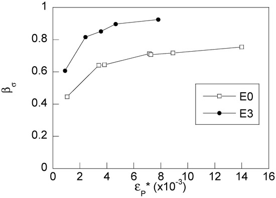 Figure 8 shows the evolution of the Bauschinger effect stress indicator βσ with the plastic pre-strain applied in testing of the steels E0 and E3. The yield stress in compression σYC, which is necessary to determine βσ according to Equation (1), was identified as the stress at which 0.2% plastic deformation was newly generated in the compression phase of the test. To this end, the compression-stage curve was plotted (mirrored) in the tension field (see the dashed line in Figure 1), and then the yield stress σYC was determined using customary procedure for the evaluation of the conventional 0.2% offset yield point. The variation of βσ shows that analysed steels exhibit the BE as far as the value of this parameter is not null for all the performed tests. This parameter increases with the plastic pre-strain showing steep variation at low plastic pre-strain values and apparent approaching of an asymptotic level at larger plastic pre-strains. The main difference between the steels E0 and E3 is due to the cold drawing induced plastic strain that caused microstructure alterations. The microstructure of the steel E3 differs from E0 (Figure 3) and induces some anisotropy in the drawing direction. Further, cold drawing is known to increase the dislocation density, the number of dislocation-dislocation interactions, and the back stress value during forward loading, thus causing the reverse yield stress decrease. These differences between steels affect their conventional mechanical behaviour evaluated by means of ordinary tension tests under monotonic loading (Figure 4). In the matter of cyclic loading, such microstructural changes also affect the Bauschinger stress indicators of both steels (see Figure 8).