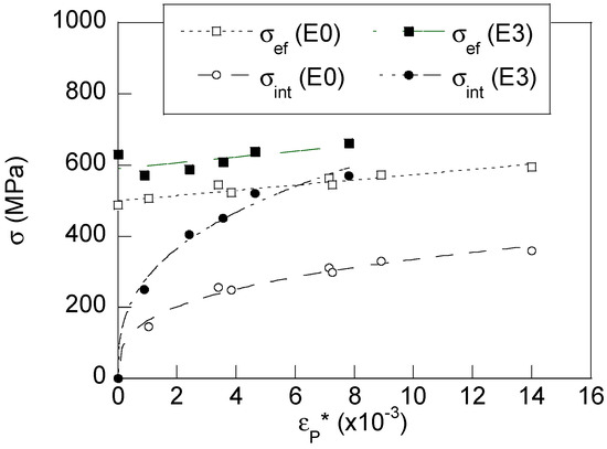 Evolution of the internal and effective stresses with plastic pre-strain for the steels E0 (open symbols) and E3 (full symbols).