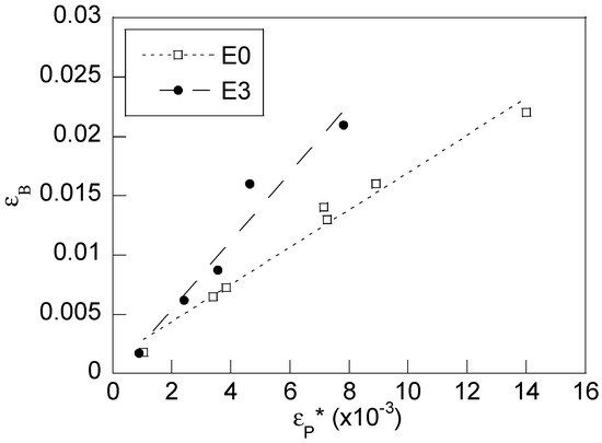 Figure 10 shows the evolution of the Bauschinger strain (εB) with the plastic pre-strain. The linear variation between these variables (the regression coefficient of the linear fitting is R = 0.989 for the steel E0 and R = 0.974 for the steel E3) indicates according to the study [41] that the steel behaviours agree with the Masing type equation.