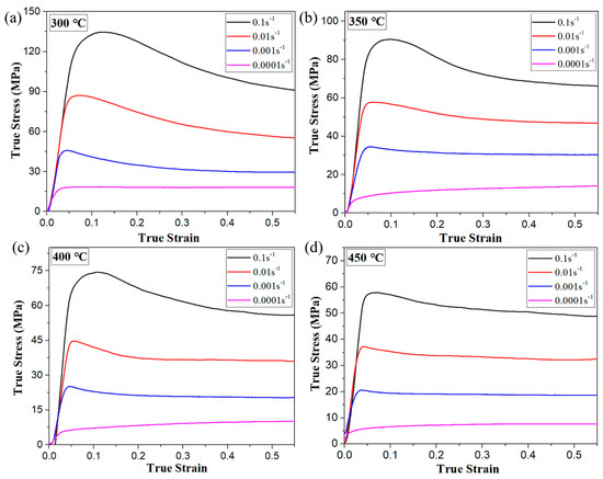 Flow stress–strain curves of nanohybrid/AZ80 composite under different compression conditions: (a) 300, (b) 350, (c) 400, and (d) 450 °C.