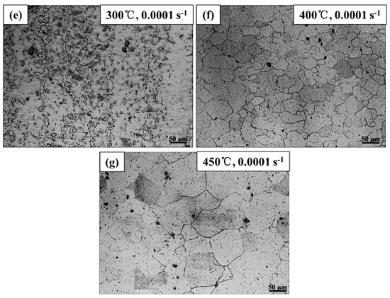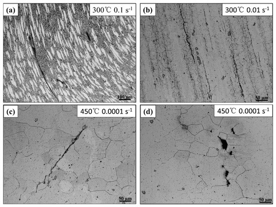 Figure 7 presents an OM micrograph showing the microstructure of the hybrid-reinforced composite deformed under different hot compression conditions. Figure 7a shows the occurrence of flow localization and the presence of microcracks at 300 °C with a strain rate of 0.1 s−1, which was due to stress concentration that was not relieved at a low temperature and fast deformation rate [31]. Figure 7b shows some microcracks that were observed at the DRX region at 300 °C with a strain rate of 0.01 s−1. This was mainly because fine recrystallized grains were easily deformed, while the original coarse non-DRX grains were poorly plasticized, so microcracks existed at the interface between coarse and small grains [32]. Many second-phase particles were observed near microcracks from Figure 7c. The formation of microcrack and microvoid was analyzed, the main reasons are as follows: