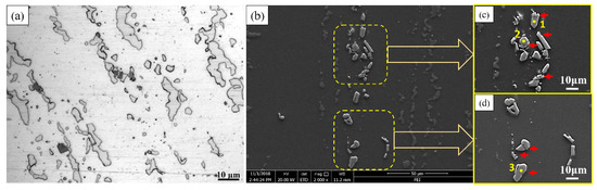 (a) OM and (b) SEM image of distribution of irregular second-phase particles along extruded strip in compression microstructure; (c,d) magnified region of yellow box displayed in (b); (e) EDS patterns of second phase particles in (c,d).