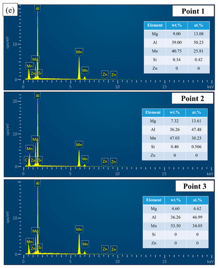 The optical microstructures of composites compressed at different temperatures of 300–450 °C and strain rates of 0.0001–1 s−1 are shown in Figure 3. It displays that the compressed microstructure of the composite kept bimodal distribution at a temperature of 350 °C and strain rate of 0.1 s−1, which was mainly due to insufficient recrystallization as a result of short deformation time. When deformation temperature was kept constant and strain rate reduced to 0.01 s−1, the degree of recrystallization increased due to the prolonged deformation time. The microstructure was mainly composed of equiaxed grains after dynamic recrystallization. When strain rate was further reduced from 0.001 to 0.0001 s−1, the growth phenomenon of dynamically recrystallized grains was more obvious. In addition, there were some irregular second-phase particles distributed along the extruded strip in the hot compressed microstructure, as indicated in Figure 4a,b. For further careful observation of the second-phase particles, the local area (yellow-box area) in Figure 4b was further enlarged, which is shown in Figure 4c,d. According to EDS results, these irregular particles mainly contained Al and Mn elements, and the atomic ratio of Al and Mn was about 1.63:1, so the irregular phases could be identified as the Al8Mn5 phase [18]. Moreover, the Al8Mn5 phase was broken during hot compression and crushed into smaller particles, as indicated by the red arrow in Figure 4c,d.