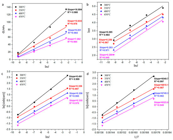 where is the strain rate (s−1), σ is the flow stress (MPa), A and α are material constants, n is the stress exponent, Q is the activation energy for hot deformation (kJ/mol), R is the universal gas constant (8.314 J·K−1mol−1), and T is the absolute deformation temperature (K).