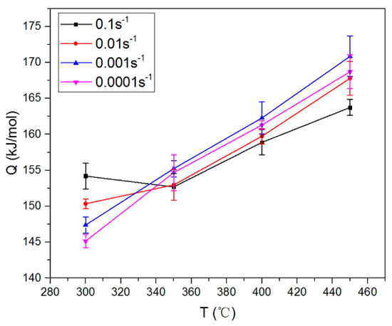 According to Equation (7), the theoretical value of deformation activation energy could be obtained (see Table 2). Q variation with deformation temperature (T) at different strain rates is shown in Figure 6. Q can be used to measure the difficulty of deformation, and its change reflects the change of the deformation mechanism, so the rise or fall of the activation-energy curve indicates that a new dislocation mechanism participates in the deformation process [9]. Obviously, it can be observed from Figure 6 that the deformation mechanism of the composite material was significantly different at different deformation temperatures and the same strain rate. For a strain rate of 0.01 s−1, the Q value of the composite slowly improved with increasing temperature (300–350 °C), and then quickly increased when deformation temperature was higher than 350 °C. When the strain rate was 0.001–0.0001 s−1, the Q value increased rapidly with increasing temperature (300–350 °C), but slowly increased when the temperature was higher than 350 °C. The phenomenon of the Q value increasing with the elevation of deformation temperature may be related to the consumption of much dislocation due to the promotion of DRX. The formation and growth of DRX require a large number of dislocations, and DRX is more intense as deformation temperature is enhanced, the tendency for dislocation consumption is increased, and stress concentration is relaxed. Therefore, the number of potential dislocation sources is reduced, and startup is more difficult, which leads to an increase in Q [10]. However, for the higher strain rate of 0.1 s−1, the deformation activation energy of the composite decreased with the rise of temperature from 300 to 350 °C, and then improved with the rise of temperature from 350 to 450 °C. This abnormal phenomenon may imply the appearance of a transition of the rate-controlling mechanism [30].