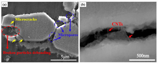 (2) The dislocations may be generated due to the mismatch of elastic modulus and thermal expansion coefficient between the matrix and the nano-reinforcement [35]. During hot deformation process, the dislocations may concentrate around SiCp and CNT, which lead the generation of stress centration at the interface between reinforcements and matrix [11,35]. As the stress become larger than interface bonding strength, microcracks might occur at the interface between SiCp-Mg or CNT-Mg, which can be illustrated in Figure 8b. During the isometric compression test, there is tensile stress at the edge of the specimen, and the microcracks (Figure 8) formed by the above reasons (1 and 2) develop into microvoids under tensile stress.