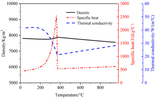 where, T, ρ, c, τ and φ are infinitesimal body temperature in °C, density in Kg/m3, specific heat in J/(Kg °C), time in s and per unit time per unit volume of the heat, which is generated by the internal heat source in J/(m3 s), respectively. λ is thermal conductivity in W/(m K). The physical properties of the steel are shown in Figure 1.