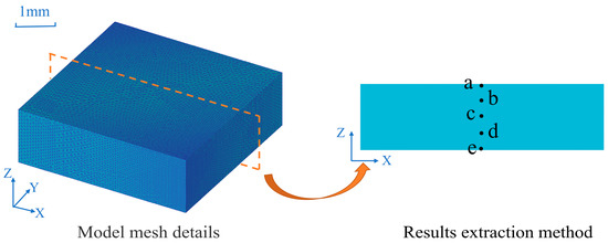 Firstly, the quenching transition process in the hot stamping process was simulated by DEFORM software. The temperature variation and phase transition in the process of quenching were simulated under the conditions: austenitizing temperature at 930 °C, austenitizing time in 5 min and the average cooling rate at 40 °C/s. The model grid and results extraction method are shown in Figure 2. The number of the model nodes was 39865, and the number of the units was 150,000. The heat transfer coefficient at the sample surface was 1300 W/(m2·°C). The initial phase microstructure of the sample was austenite with volume fraction of 1.0. The parameters used in the simulation are listed in Table 1. The steel used for quenching was ultra-high strength hot-stamping steel, and its composition is shown in Table 2. The steel we used is 28MnB5 hot-formed steel produced by a steel plant in China. The steel was a 1800 MPa grade automotive hot-formed steel with a thickness of 1.5 mm, which can be used for making anti-collision beams. The phase transition parameters of the steel were calculated by JMatPro software, and then were imported into DEFORM software for calculation. The same method was used to simulate the phase transition process with the average cooling rate of 10 °C/s and 25 °C/s with austenitizing temperature at 930 °C and austenitizing time in 5 min. The surface heat transfer coefficients corresponding to 10 °C/s and 25 °C/s were 340 W/(m2·°C) and 850 W/(m2·°C), respectively. Then the simulation results of a, b, c, d and e on the cross section of the sample were compared and analyzed.