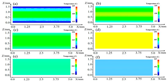Temperature distribution under different quenching time: (a) 3 s, (b) 6 s, (c) 9 s, (d) 12 s, (e) 15 s and (f) 18 s.