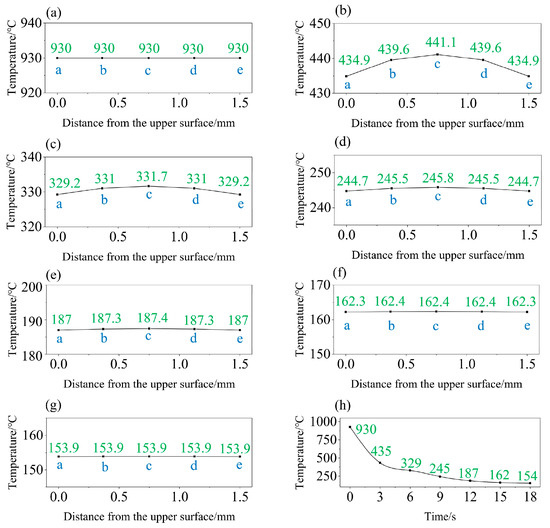 As shown in Figure 3a and Figure 4b, the temperature of the hot-stamping steel sample increased gradually from outside to inside at the quenching time of 3 s. The temperature of location c in the center was 441.15 °C and the temperature of location a on the surface was 434.86 °C The temperature on the surface was around 10 °C lower than that in the center because of the strong heat transfer between the sample surface and the die. In addition, the surface temperature drop rate was greater than that inside the hot-stamping steel. When the quenching time reached 12s, the temperature of location c in the center of the sample was 187.41 °C, and the temperature of location a on the surface was 186.98 °C, the temperature distribution of the sample tended to be uniform, indicating that the hardenability of the hot-stamping steel was good to meet the requirements of the existing process. In the whole quenching process, The temperature drop rate in the first three seconds was the fastest, and the surface temperature of the sample dropped rapidly from 930 to 435 °C. Then the cooling rate came down and the temperature of the sample gradually decreased as the quenching going on.