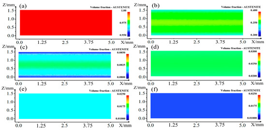 Austenite volume fraction and distribution during quenching process: (a) 3 s, (b) 6 s, (c) 9 s, (d) 12 s, (e) 15 s and (f) 18 s.
