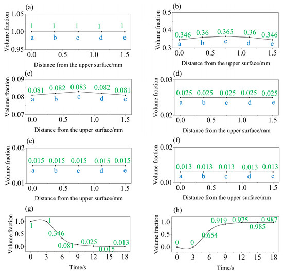 Variation of the phases volume fractions during quenching process: (a) austenite fraction at 3 s, (b) austenite fraction at 6 s, (c) austenite fraction at 9 s, (d) austenite fraction at 12 s, (e) austenite fraction at 15 s, (f) austenite fraction at 18 s, (g) austenite fraction versus time at location a and (h) martensite fraction versus time at location a.