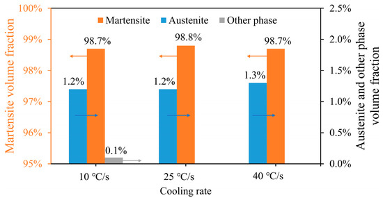 Figure 7 shows the phase compositions of the steel after quenching at different cooling rates. With the increase of the cooling rate, the content of the residual austenite tended to increase, and the phases of bainite and ferrite disappeared. When the cooling rate was 10 °C/s, the main phase was martensite in 98.7%, and the residue austenite was 1.2%, and the other phases such as bainite and ferrite were 0.1%. When the cooling rate increased to 25 °C/s, the volume fraction of the martensite was 98.8%, and the content of the austenite was 1.2%. The other phases disappeared. When the cooling rate was 40 °C/s, the volume fractions of the martensite and the austenite were 98.7% and 1.3%, respectively. The results indicate that with the increase of the cooling rate, ferrite and bainite were inhibited and austenite tended to increase. Thus, it is beneficial to improve the strength and the plasticity of the current hot-stamping steel with ultra-high strength. In the actual hot-stamped process, the cooling rate was 40 °C/s. According to the calculation results, there were more austenite in the cooling rate at 40 °C/s, so the cooling rate at 40 °C/s could meet the demand of the actual production process.