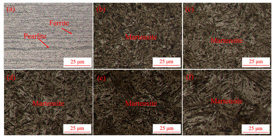 Microstructures of the hot-stamping steel after different austenitizing temperatures: (a) original sample, (b) 840 °C, (c) 900 °C, (d) 930 °C, (e) 960 °C and (f) 990 °C.