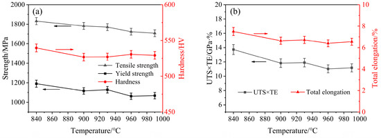 The variation of the mechanical properties after different austenitizing temperatures: (a) Strength varies with temperature, (b) Strength-ductility product and total elongation vary with temperature.
