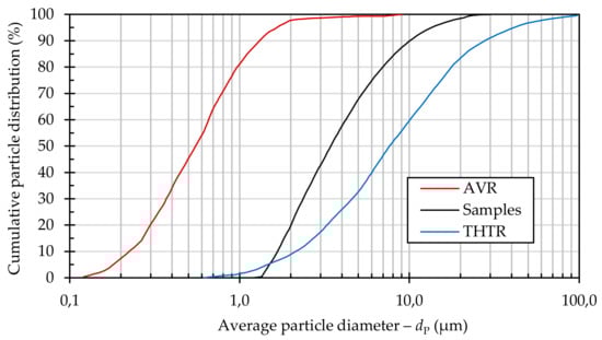 Test samples with a wall thickness of 2 mm and an area of 30 × 22.5 mm2 (geometry was determined by the autoclave design) were exposed to a 950 °C hot particle-laden helium flow over a period of 60 s in the DRESDEN-TUBE test facility [26]. The samples were cooled from the underside. Because of the temperature gradient, graphite particles were deposited directly on the sample. A time of 60 s was sufficient to create a single particle deposition layer where individual particles were visible to determine the morphological change. Afterwards, the samples were transferred to DRESDEN-TANK for thermal annealing (Section 3.2). By selecting a suitable graphite particle distribution of the initial bed, a mean particle size distribution could be thermophoretically separated on the samples which approximately corresponds to previously published data (Figure 1). The size distributions of graphite particles were determined after decommissioning or dismantling in the AVR [5] and in the thorium high-temperature reactor (THTR) [27] in the pipe segments of the primary circuit.