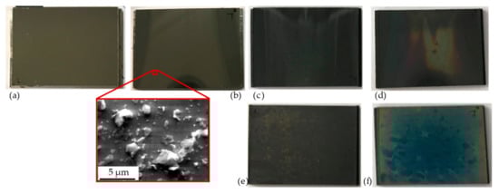 Substrate before coating in DRESDEN-TUBE (a), before (b) and after thermal annealing in the DRESDEN-TANK for 100 h at 750 °C, 6 MPa helium; with particles: (c) Alloy 800H, (d) Inconel 617; without particles: (e) Alloy 800H, (f) Inconel 617.