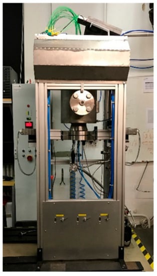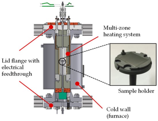 The main component of the test plant is the high-pressure temperature autoclave, which was actualized as a cold-wall furnace that can be filled with gaseous fluids. In the pressure-tight sealable sample chamber (Ø = 55 mm and height = 200 mm), substrates loaded in various states (graphitic or metallic) can be introduced and thermally annealed in various atmospheres, and can include helium, argon, nitrogen, air, or mixtures of these. The temperature can be varied within a range of 25 to 1000 °C. Controllable multi-zone heating (3 × 1 kW) ensures a stable and homogeneous temperature distribution in the area of the particle-laden sample during stationary operation. The axial temperature field is monitored by 20 thermocouples that are mounted radially between the sample holder and the inner wall over the entire height. At the same time, up to eight samples can be positioned in the center of the chamber with the help of a corresponding sample holder. In addition, axial rotation of the samples is possible in order to allow centrifugal forces to act on the particles.