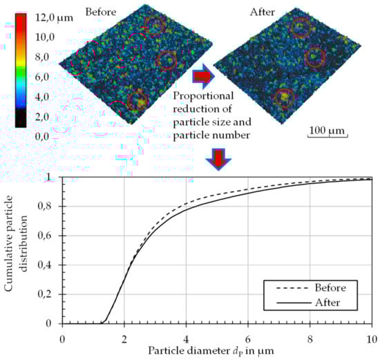 The geometric change in the particle morphology was determined by laser scanning microscopy (Keyence VK9300, Osaka, Japan). For this purpose, a height profile of each particle-laden surface was created before and after thermal annealing, and both were compared with one another; exact sample positioning makes it possible to find and measure the same particle before and after thermal annealing. Figure 5 shows this process. For each sample, 400 individual profiles with dimensions of 283 × 213 µm2 were recorded. By extrapolating these results over the entire sample area, statements could be made about the entire particle distribution within a given sample. With a maximum of 400 detected particles per profile, the geometric data of up to 100,000 particles were available for the generation of the cumulative frequency distribution of particle size. Thus, very detailed conclusions on particle size changes could be made.