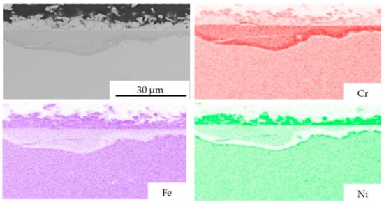 In order to represent the process in the material, microsections of the samples were produced and analyzed using SEM-EDX mapping (Figure 7). A top layer can be observed to have formed on the substrate, and, at the same time, alloy constituents have become depleted in the substrate layer close to the surface, depending on the time and zone. The grown-on-top layer contains, in particular, the elements Fe and Ni, which diffuse from the substrate volume to the surface and whose concentration decreases in the near-surface layers, weakening the substrate. At the same time, chromium accumulates in this area, leading to an increase in the brittleness of the near-surface layers.