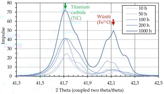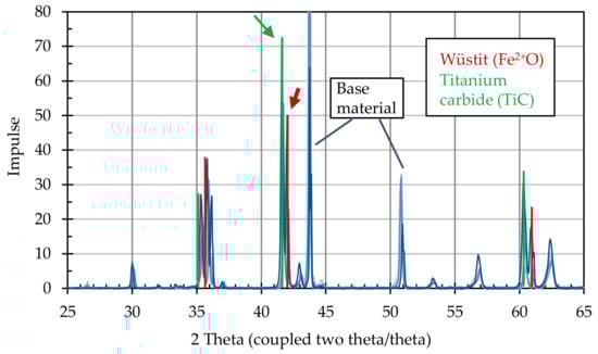 In order to describe the newly formed crystalline structure, samples with and without particle loading were analyzed simultaneously. After deduction of the ground state, iron oxide (FeO) in the phase wüstite (Fe2+O) and titanium carbide (TiC) could be detected (Figure 8). FeO is formed by the reaction of the iron with the oxygen present as an impurity, whereas TiC is formed by the reaction of the graphite particles with the titanium present in the structural material. In order to show the time-dependent growth of both compounds, two adjacent peaks are shown in Figure 9. However, several compound typical peaks are used for identification which are distributed over the entire spectrum.