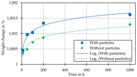 Since the growth of the layer makes it impossible to purely consider the particle change, the weight change was determined for the description of the time-dependent process (Figure 10). For both substrates (with and without particle loading), a change in weight can be observed which can be described by logarithmic behavior. Figure 10 also shows that the presence of graphite particles leads to a higher weight change in the Alloy 800H substrate. The thermochemically-induced increase in the oxide layer by the previously present graphite particles can be seen as the reason for this.